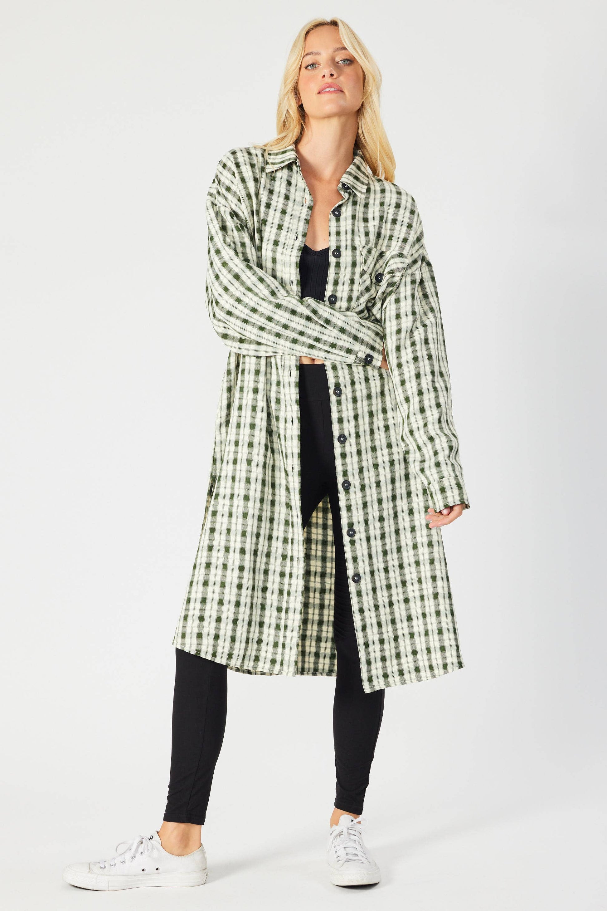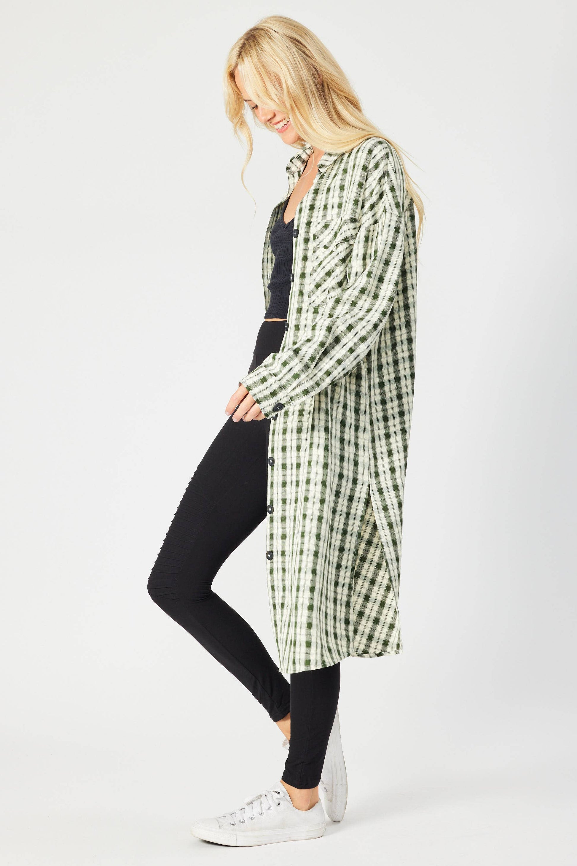 This olive and ivory plaid shacket is a versatile addition to any wardrobe. With its button-down design and midi length, it can be worn as a shirt or jacket. The added benefit of pockets makes it both functional and stylish. Perfect for a casual yet put-together look.